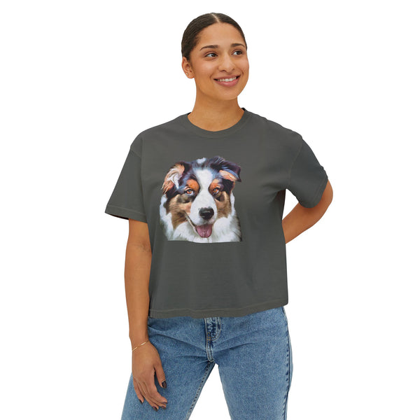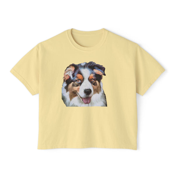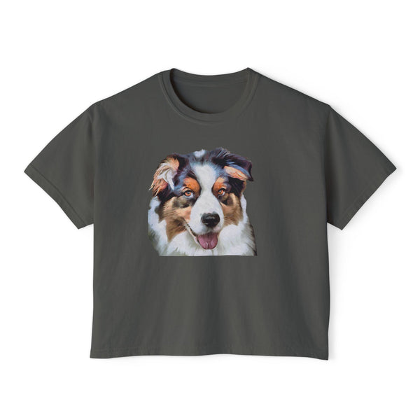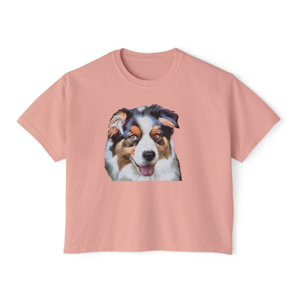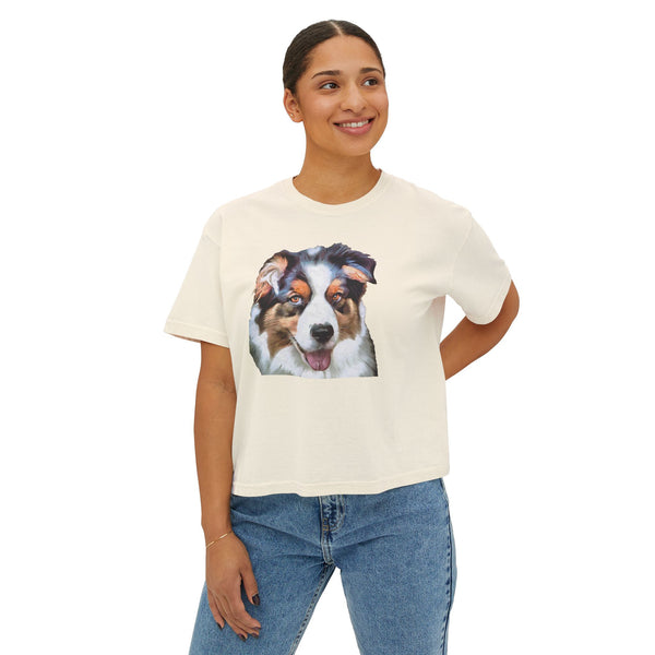 Introducing the Australian Shepherd #2 - Women's Oversized Boxy Tee, a perfect blend of comfort and artistry. Crafted from 100% ring-spun cotton, this tee envelops you in softness, making every moment feel cherished. The boxy fit and slightly cropped design create an effortlessly chic silhouette, ideal for casual outings or cosy evenings spent dreaming. With its enchanting original painting-inspired design, this tee captures the spirit of the Australian Shepherd, letting you wear a piece of art that resonates with nature’s beauty. Ethically sourced and dyed with OEKO TEX-certified colours, it embodies the essence of sustainable fashion.