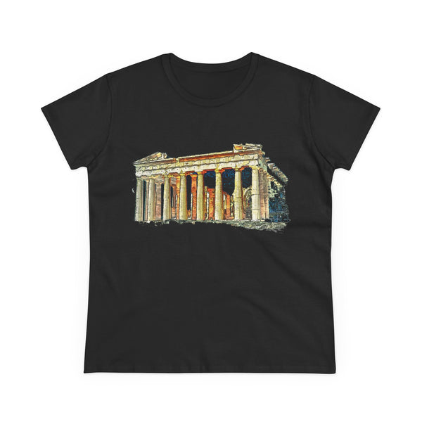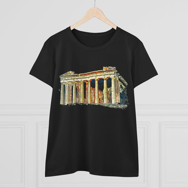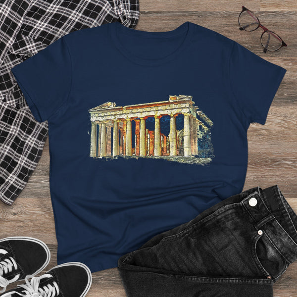 Indulge in the Parthenon Women's Midweight Cotton Tee, where cloud-like comfort meets effortless elegance. Crafted from 100% soft, pre-shrunk cotton, this tee envelops your skin in sublime softness all day long. Its semi-fitted silhouette and cap sleeves provide a flattering shape while allowing free movement, making it the perfect companion for any occasion. Designed for lasting quality, the taped neck and shoulders ensure durability, maintaining its refined form wash after wash. Elevate your everyday style with this essential piece, embodying the spirit of Greek Islands through beautiful simplicity.