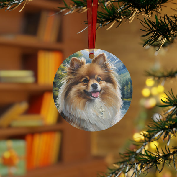 Introducing the German Spitz Christmas Tree Metal Ornament, an exquisite addition to your holiday décor. Crafted from durable, scratch- and chip-resistant white aluminum, this ornament features festive prints on both sides for enhanced visibility. Choose from four elegant shapes—bell, tree, round, or oval—each adorned with a cheerful red ribbon for effortless hanging.