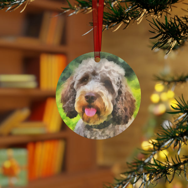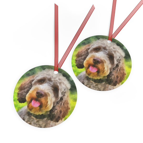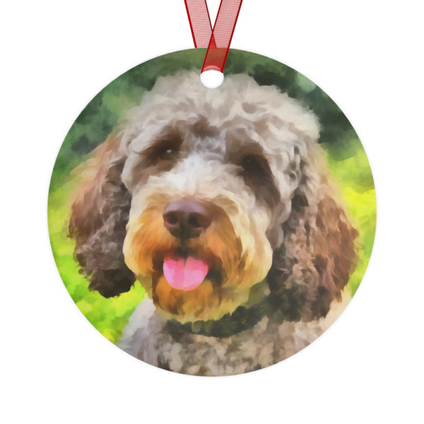 Introduce a touch of charm to your holiday decor with the Lagotto Romagnolo 'Italian Truffle Dog' Metal Ornaments. Crafted from scratch and chip-resistant white aluminum, these delightful ornaments showcase festive designs on both sides, ensuring they shine bright for years to come. Available in four enchanting shapes—Bell, Tree, Round, and Oval—each ornament comes with a lovely red ribbon for easy hanging, adding a unique accent to your tree.