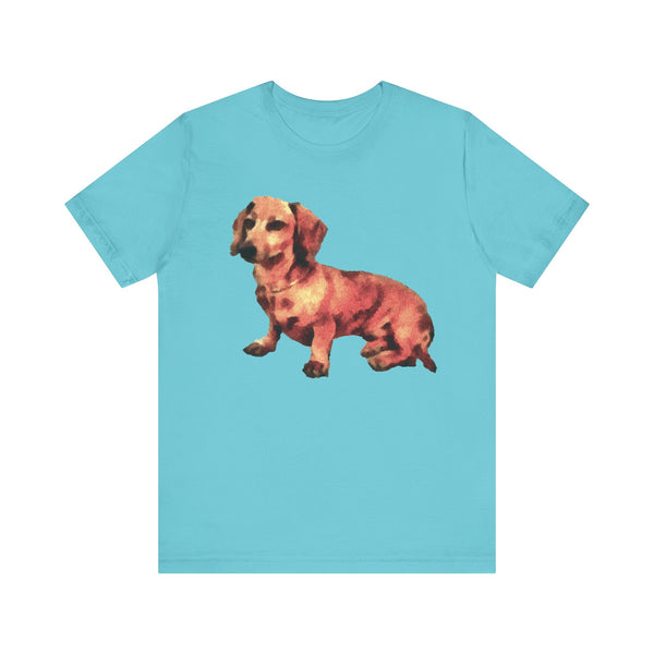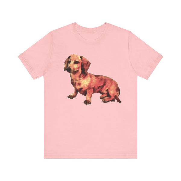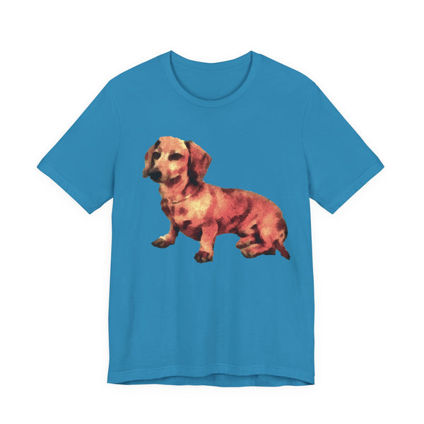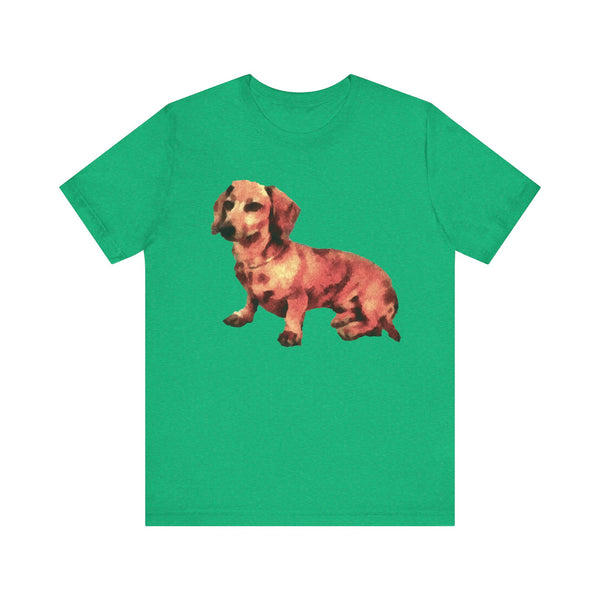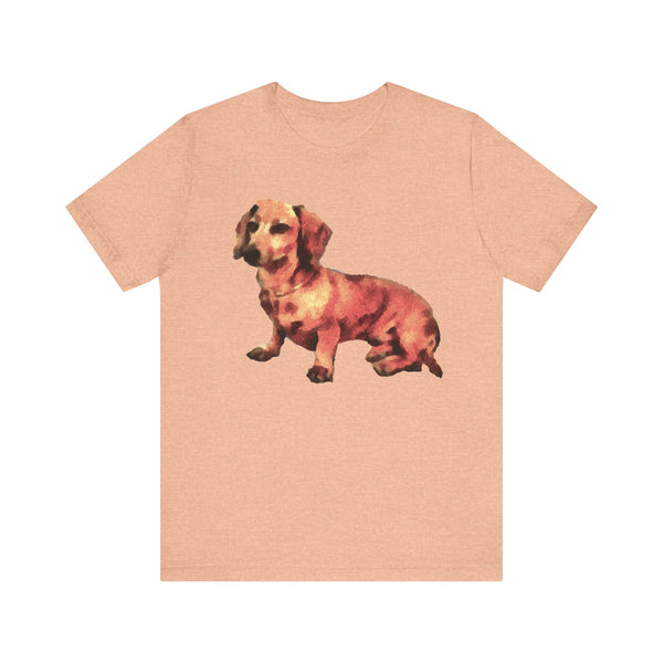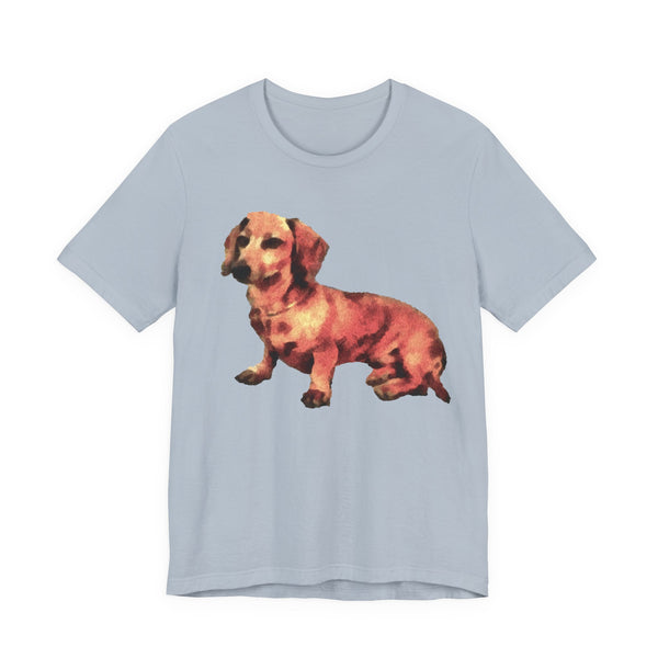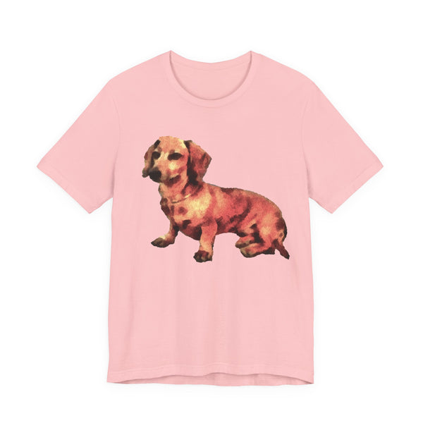 Introducing the Dachshund 'Simone' - Unisex Jersey Short Sleeve Tee, a delightful tribute to your favorite feisty furball! This classic tee hugs your body like a beloved friend, crafted from soft, 100% Airlume combed and ringspun cotton. With a light fabric weight, it promises durability and vibrant print quality that will stand the test of time. Plus, its ribbed knit collars and taped shoulders ensure a perfect fit that retains its shape, making this tee an essential addition to your wardrobe for any occasion.