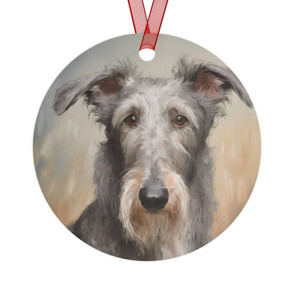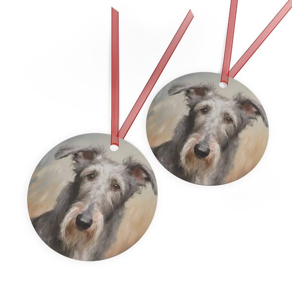 Celebrate the grandeur of the majestic Scottish Deerhound with these stunning metal ornaments, perfect for adding a regal touch to your holiday décor. Crafted from durable white aluminum, these beauties resist scratches and chips, ensuring they shine bright year after year. Each ornament showcases festive designs on both sides and comes with a separate red ribbon for easy hanging. Ideal for your Christmas tree or as a thoughtful gift for any sighthound lover, bring home a piece of the Royal Dog of Scotland this season. - Made from durable white aluminum - Glossy finish resists scratches - Festive designs printed on both sides - Includes red ribbon for hanging