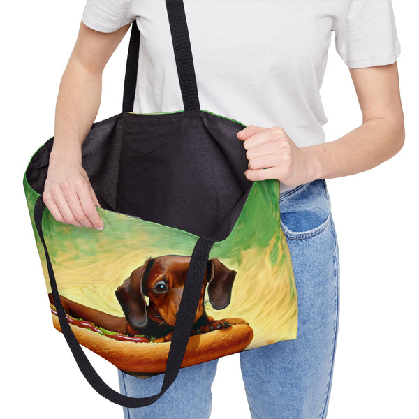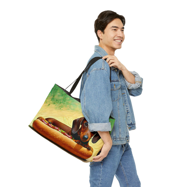 Introducing the Adorable Dachshund - Weiner Dog Weekender Tote Bag, a delightful companion for all your adventures! With its playful design and energetic colors, this tote promises to add a sprinkle of whimsy to every outing. It boasts a roomy size of 24" x 13" for all your weekend essentials, complemented by a cheerful black interior. Crafted from durable spun polyester, it retains its shape and charming hues, making it ideal for beach trips or picnics. A perfect gift for the weiner dog lover, showcasing the famously long, low silhouette and ever-alert expression of these beloved pups.
