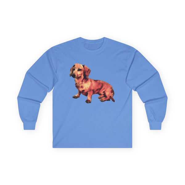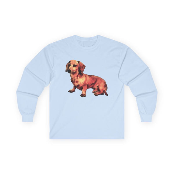 Meet the Dachshund 'Simone' Unisex Cotton Long Sleeve Tee, a delightful tribute to our beloved weiner dog with its famously long, low silhouette. Embrace your whimsical side while donning this soft, eco-friendly cotton tee that wraps you in comfort. With its classic fit and seamless design, it beautifully frames your shoulders to ensure you sport that ever-alert expression in style. Perfect for dog lovers and those who appreciate a bold, vivacious personality.