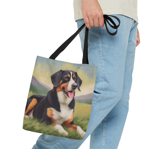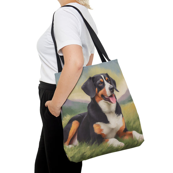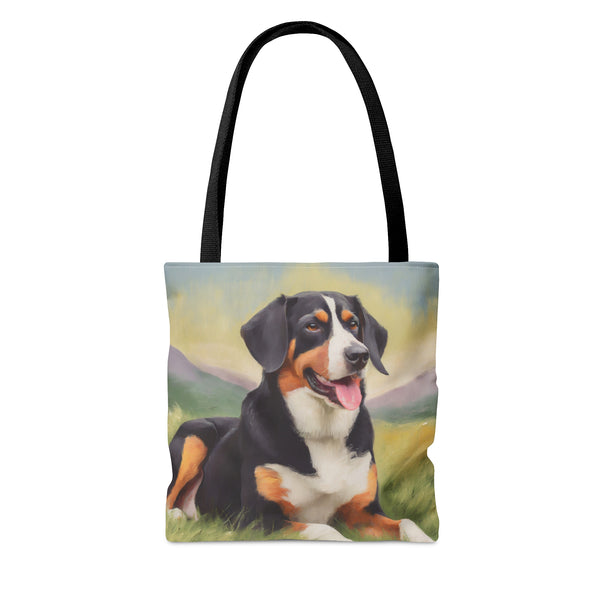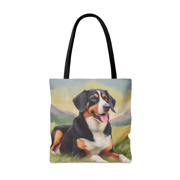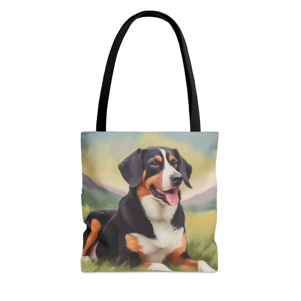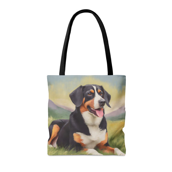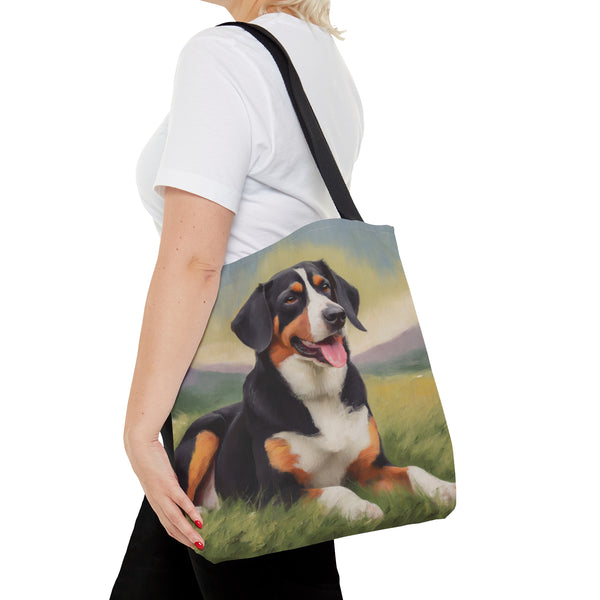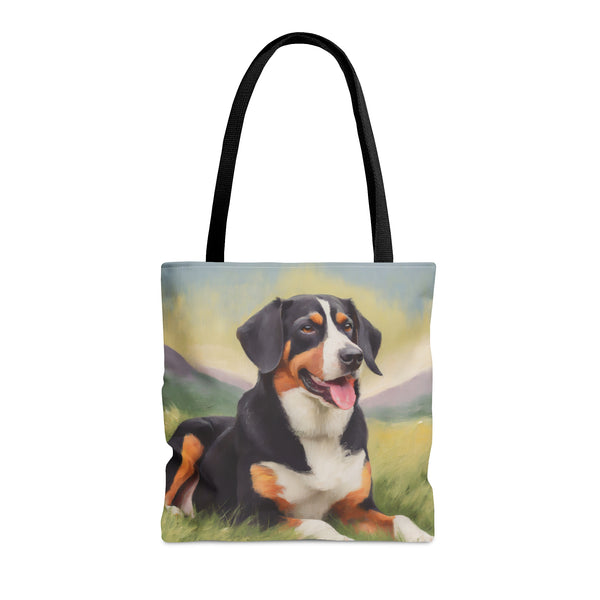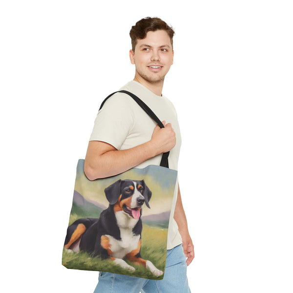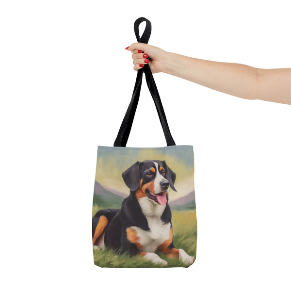 Introducing the Entlebucher Mountain Dog Tote Bag, your stylish companion for beach days and errands alike! With an all-over print showcasing your love for the agile and loyal Entlebucher Sennenhund, this tote is both practical and eye-catching. Made from durable 100% polyester, it withstands daily adventures with ease. Available in three sizes, it features a spacious storage compartment and sturdy black cotton handles for effortless carrying.