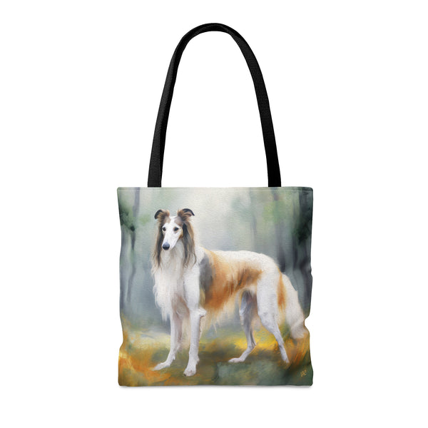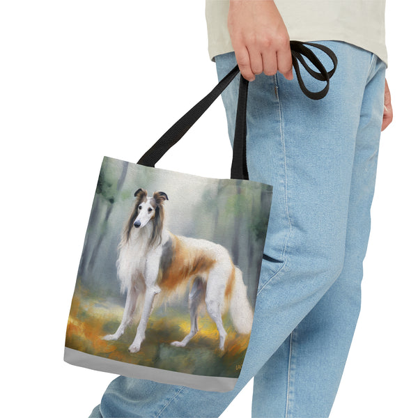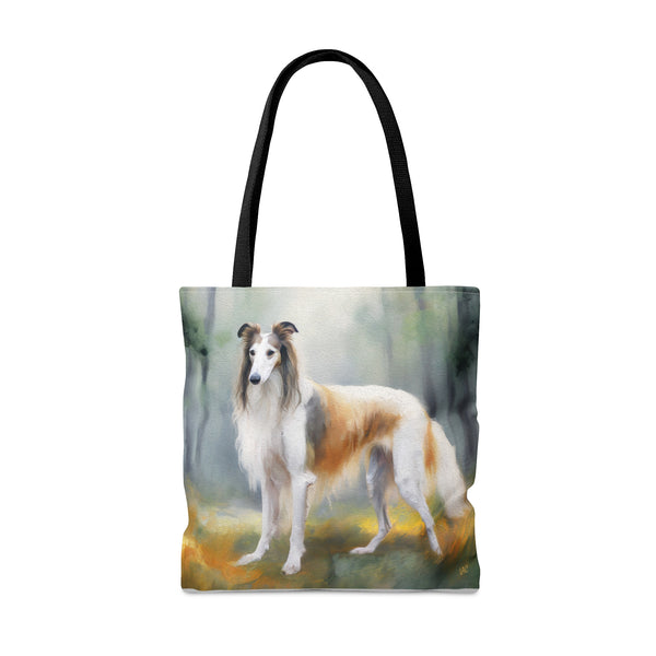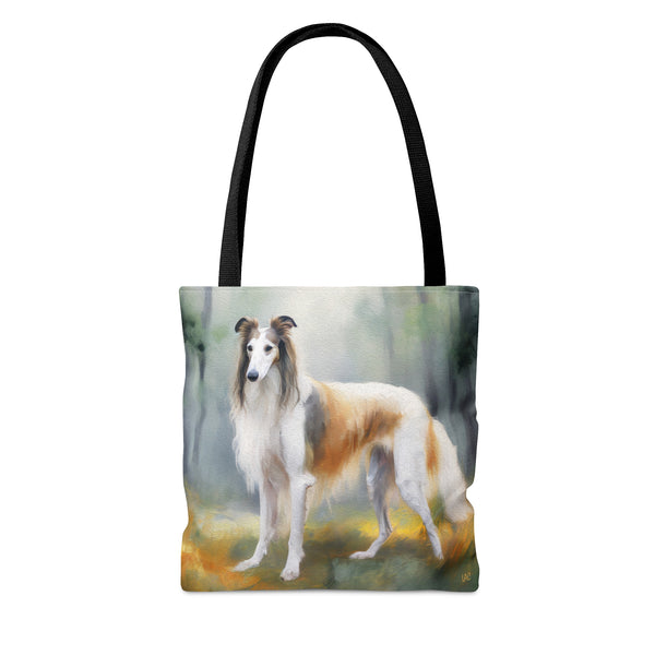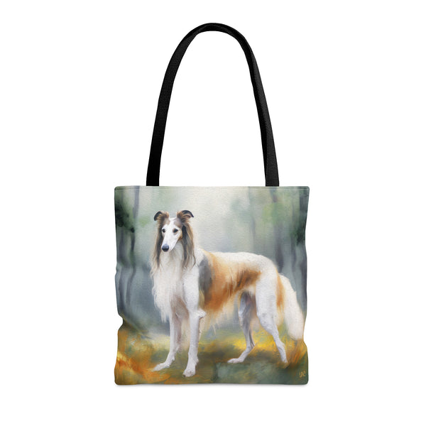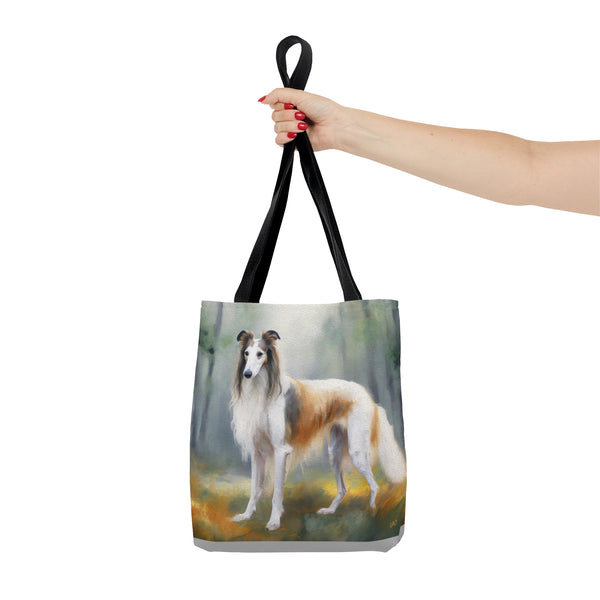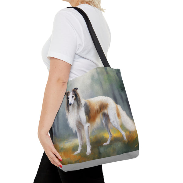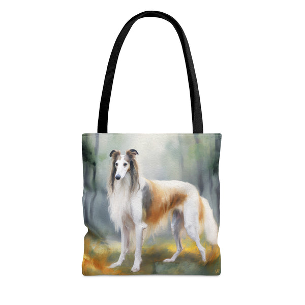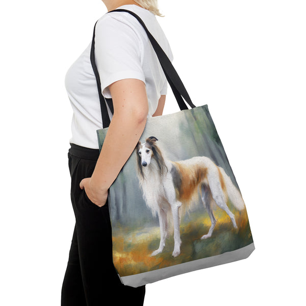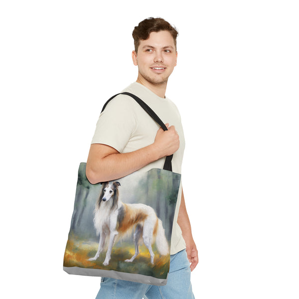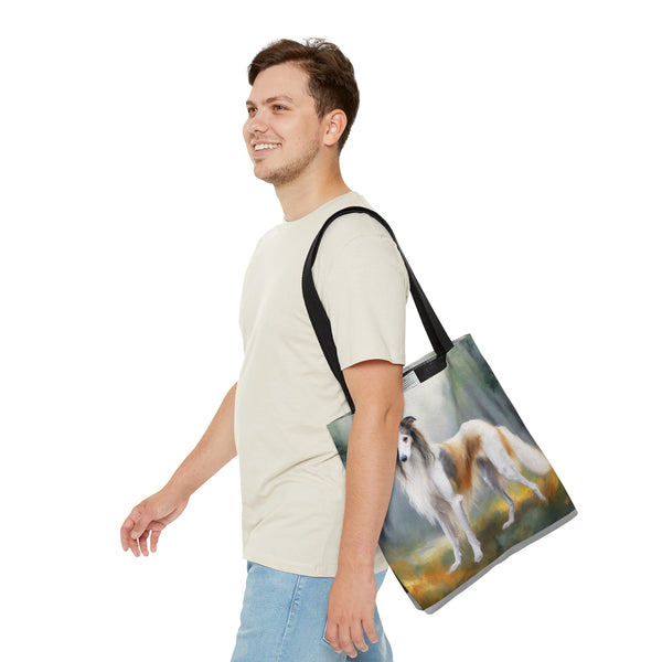 Embrace the elegance and mystique of the Borzoi 'Russian Wolfhound' Tote Bag. This exquisite accessory combines beauty with practicality, crafted from 100% durable polyester that withstands daily adventures. The captivating all-over print showcases an original painting, reflecting the noble and statuesque essence of the Borzoi, making a striking statement whether you're strolling along a sandy beach or navigating a bustling city.