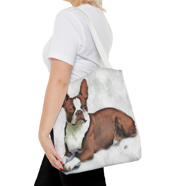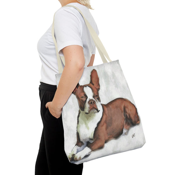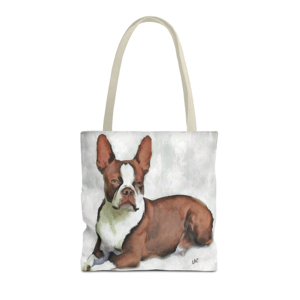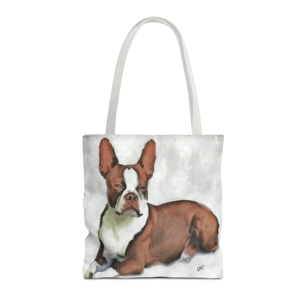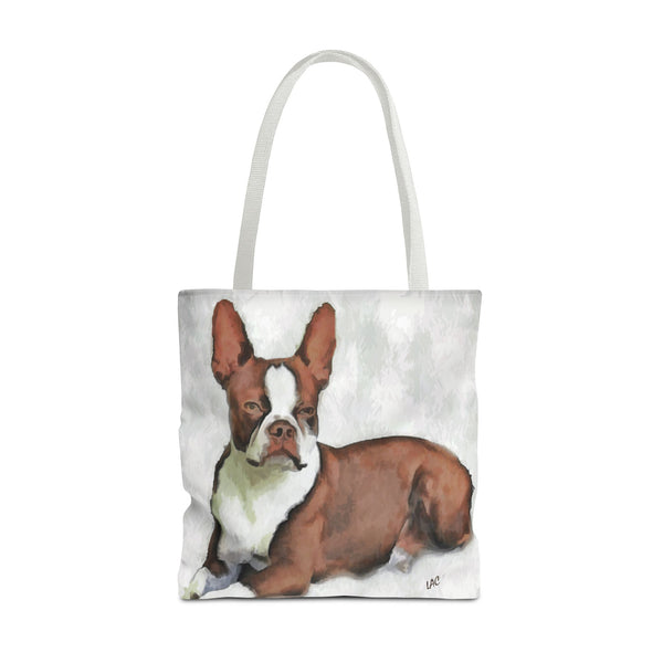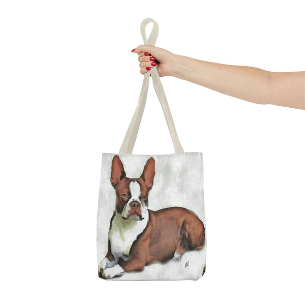 The Boston Terrier Brown & White Polyester Tote Bag features a comical design inspired by original paintings, capturing the playful essence of this beloved breed. This durable bag is crafted from 100% spun polyester with double-stitched seams, making it a reliable choice for carrying your essentials every day. Enjoy the versatility of customizable options, allowing you to choose sizes and handle colors that reflect your personal style, enhancing your daily carry.