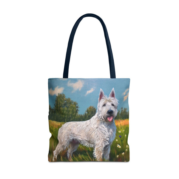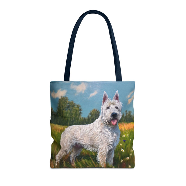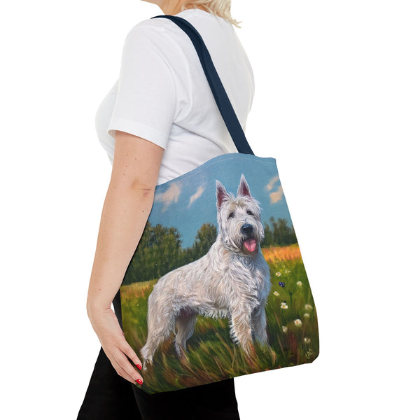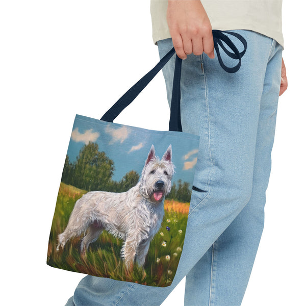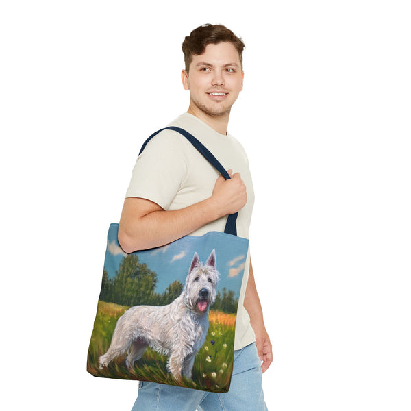The Bouvier des Ardennes - Polyester Tote Bag (AOP) is a unique accessory inspired by the elegance of the Belgian cattle herding dog. Each design is a tribute to this noble breed, transforming art into a functional piece. Crafted from 100% spun polyester, this bag features reinforced seams and sturdy cotton webbing straps, offering both style and durability. Available in three sizes and five handle colors, it allows for personal expression while complementing various outfits.