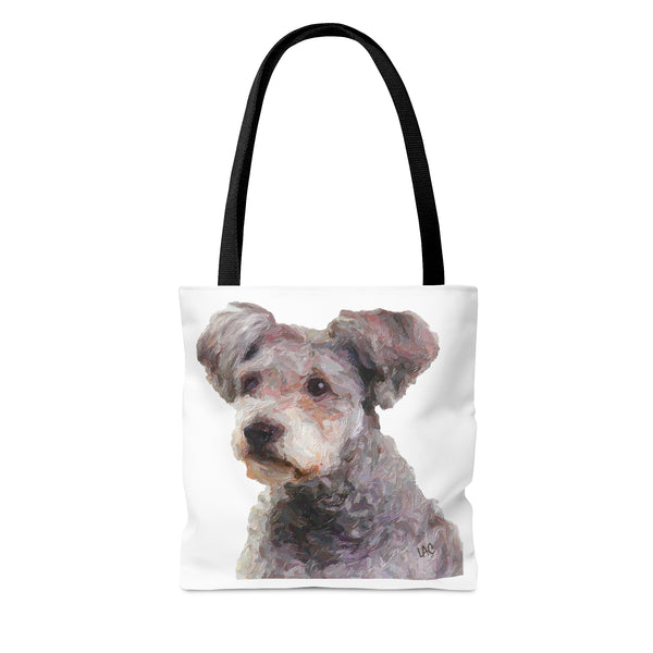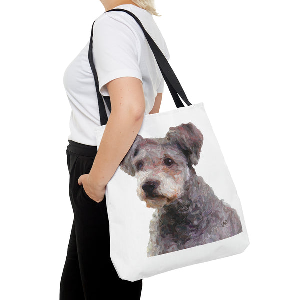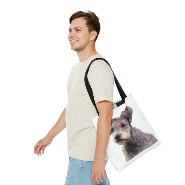 Introducing the Hungarian Pumi Tote Bag: a delightful companion for beach adventures or city strolls. This tote, made from robust materials, is designed for countless escapades. With a spacious 18 x 18-inch size, comfy black cotton handles, and charming boxed corners for extra stability, it embodies practicality and style, ready to accompany you wherever you go.