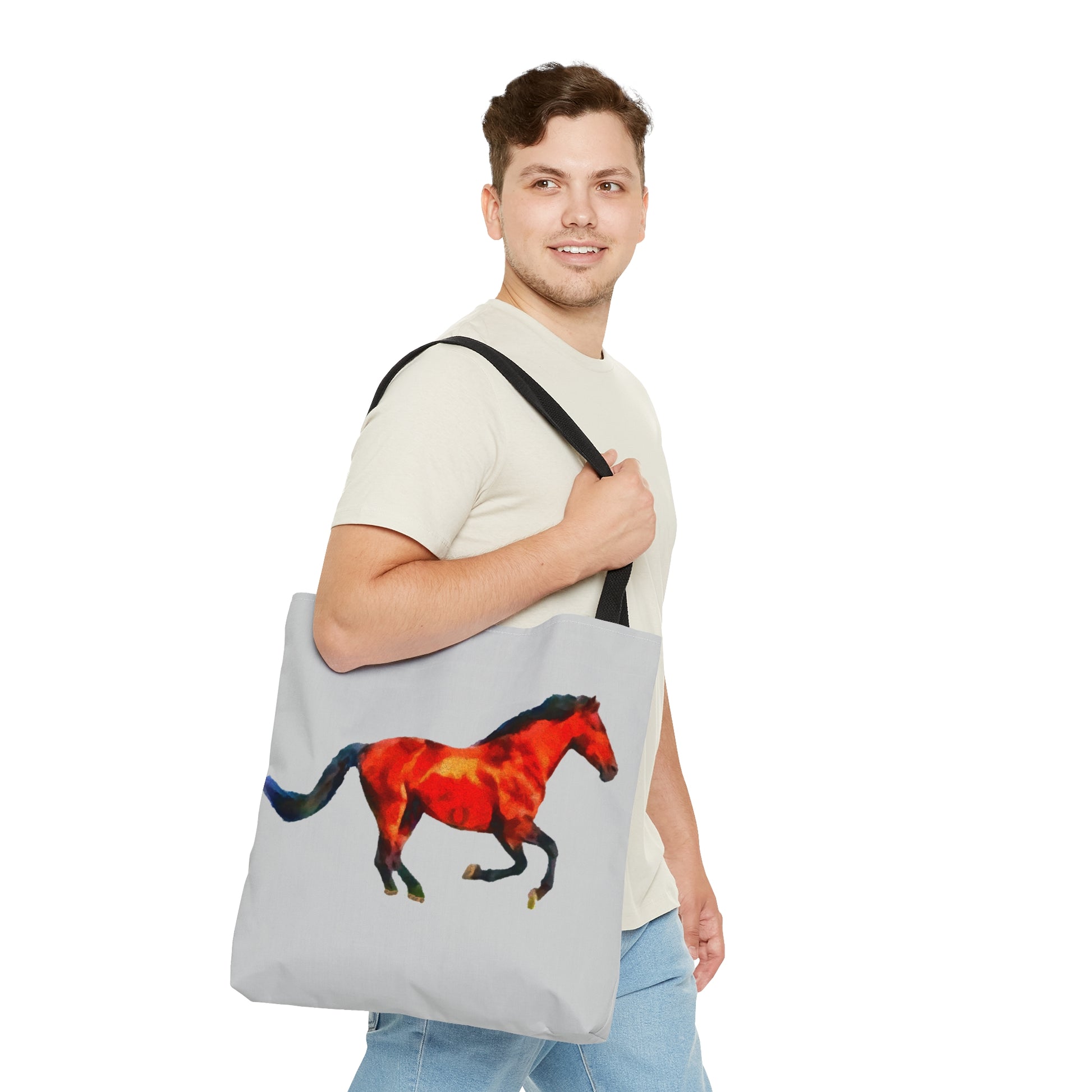 Meet the Horse 'Old Red' Tote Bag, your ultimate partner for both sandy beach escapades and vibrant city explorations. With a blend of comfort and style, this tote effortlessly complements any outfit. Made from 100% polyester, it's built for endurance and stays by your side season after season. Thoughtful touches like boxed corners, black inner stitching, and sturdy cotton handles ensure it's both practical and chic.